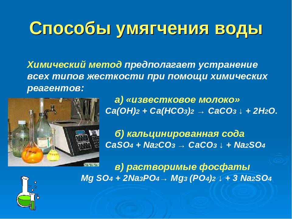 Метод позволяет преобразовать растворяющиеся вещества в нерастворяющиеся. Действие заключается в использовании различных реактивов. Например, карбонаты выводятся известью, а сульфаты – содой. Нередко в специальных системах применяют синтетические соединения. Простейшие реагенты, которые понижают жесткость: