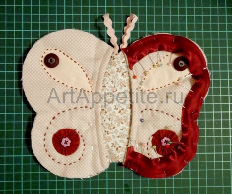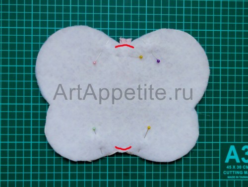 Укрепляем клеевым синтепоном одну основную деталь. Сложив её со второй деталью лицевыми сторонами друг к другу, фиксируем булавками. Из двух кусочков тесьмы вырезаем усики, прикалываем их. Пристрачиваем двумя строчками. На фото эти строчки выделены красными линиями. Разрезаем в двух местах синтепон у основания крыльев, выворачиваем тельце.