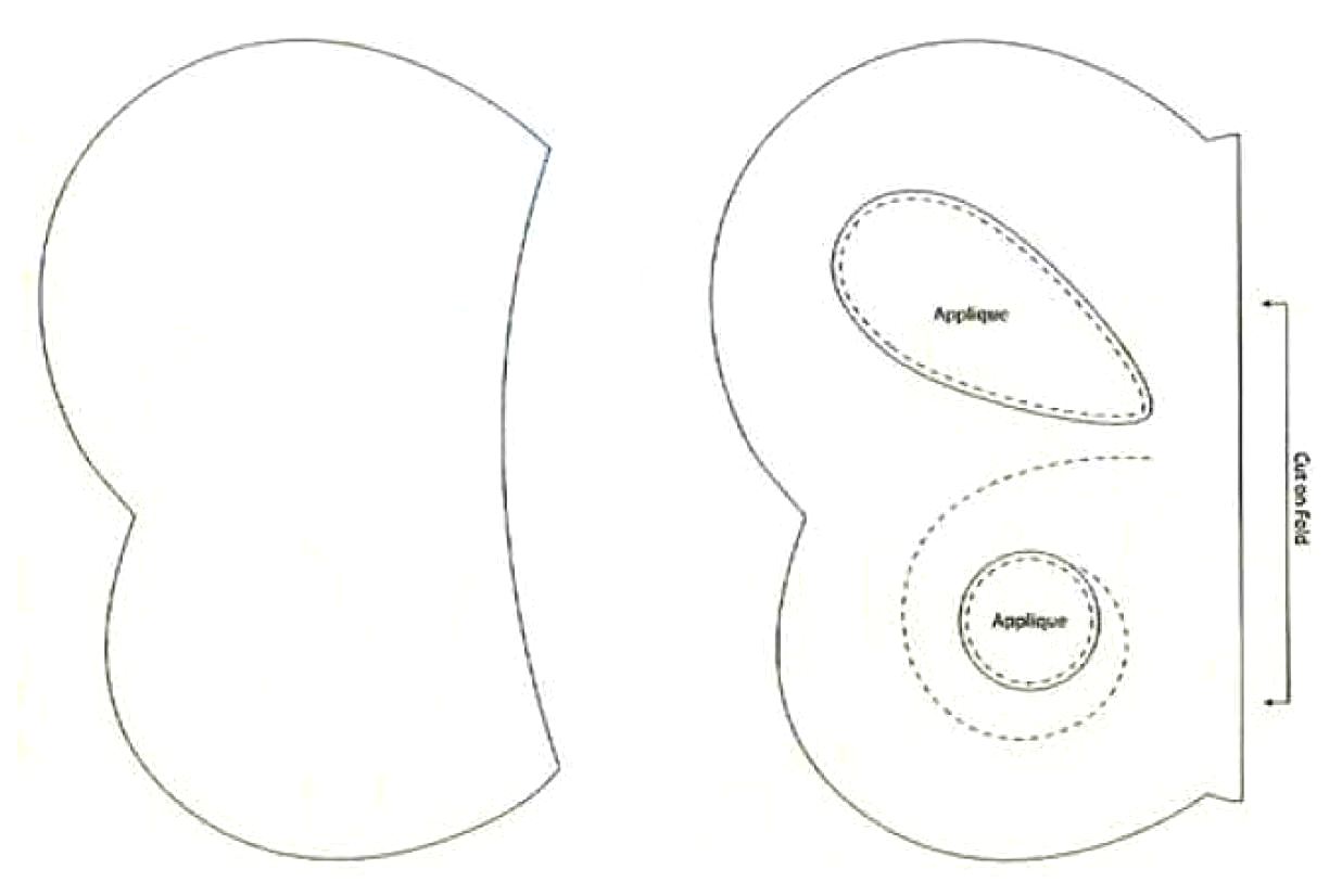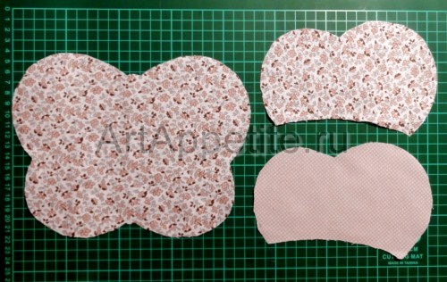 Рисунок переносится на ткань и аккуратно прорисовывается. Деталей основной ткани и наполнителя должно быть по две. Таким образом, всего выходит четыре основных элемента. Они должны быть одинаковыми и с дополнительным припуском 0,7-1 мм по краям для припусков!