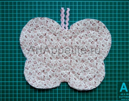 - Сначала прострочите вместе детали основного тела бабочки: наполнитель посреди двух тканевых основ, уложенных лицевой стороной наружу.