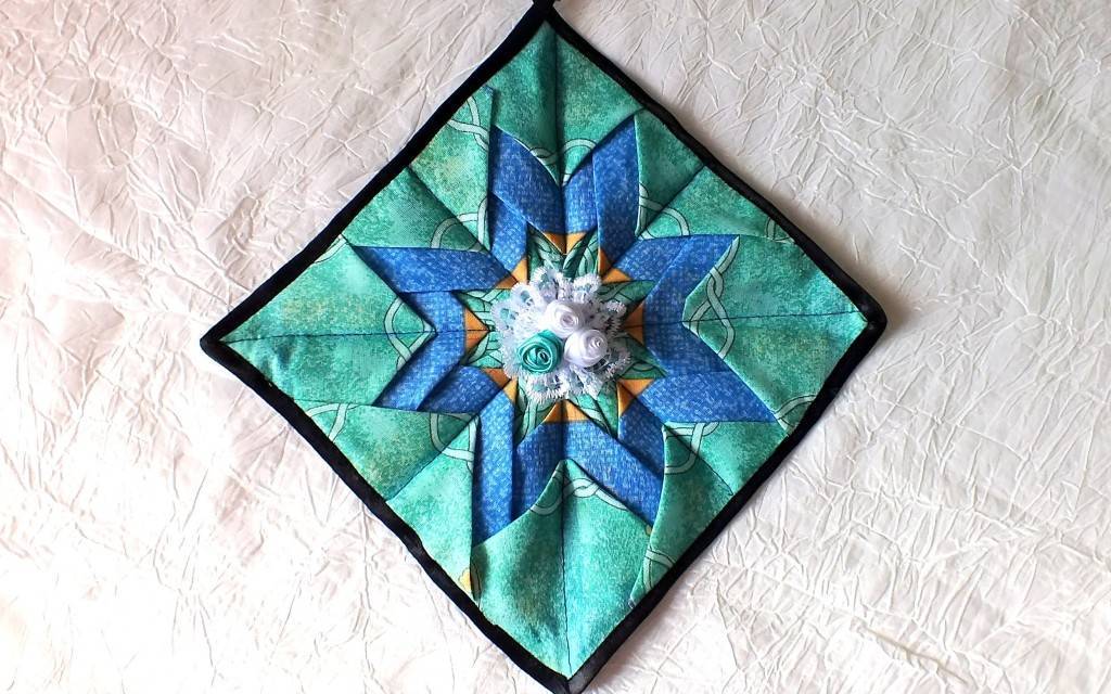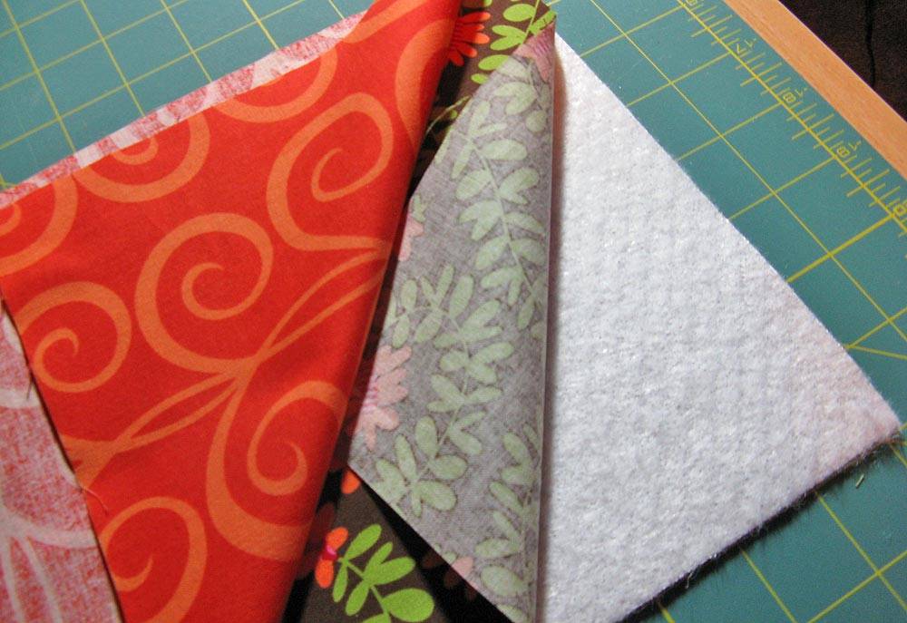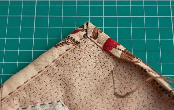 Для выполнения работы в данном стиле лоскутки нашиваются на одно из предварительно выкроенных оснований. Далее собирается сама прихватка обычным способом — наполнитель между двумя основами (облицовочная ткань укладывается изнанкой наружу).