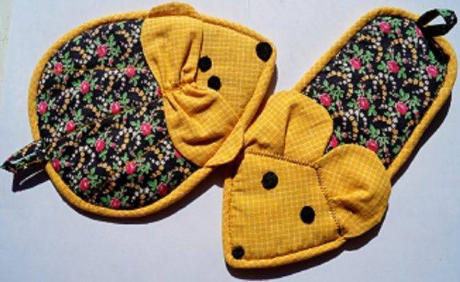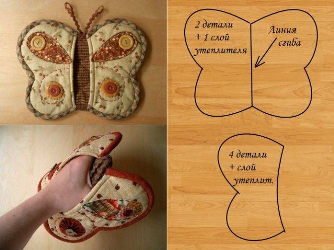 - «бабочка» — выполняется из двух одинаковых деталей, сшиваемых друг с другом. Ими берут сковородки, горячие банки после стерилизации, прочие предметы, не имеющие ручек;