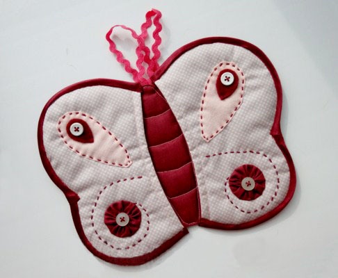 В выкройке прихватки бабочки в натуральную величину есть своя особенность — она делается специально, чтобы потом ее одевать только на пальцы рук. Углубление не глубокое, а при движении пальцев, находящихся в «бабочке», можно уловить взмах ее крылышек. С ней не страшны никакие ожоги пальцев и ладони.