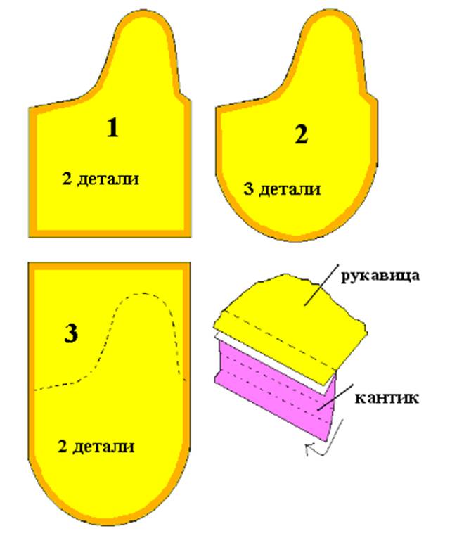 Для одной рукавички потребуется по выкройке вырезать четыре детали из облицовочной ткани (если снаружи и внутри варежка будет одинаковой) и две детали из наполнителя.