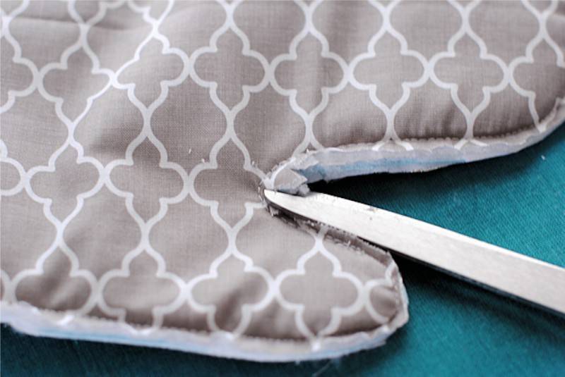 - Аккуратно, чтобы не повредить шов, отрезать лишнюю ткань по краю, сделать небольшие надрезы там, где есть закругления. Это нужно для того, чтобы после выворачивания на рукавице не образовалось некрасивых и ненужных складок.
