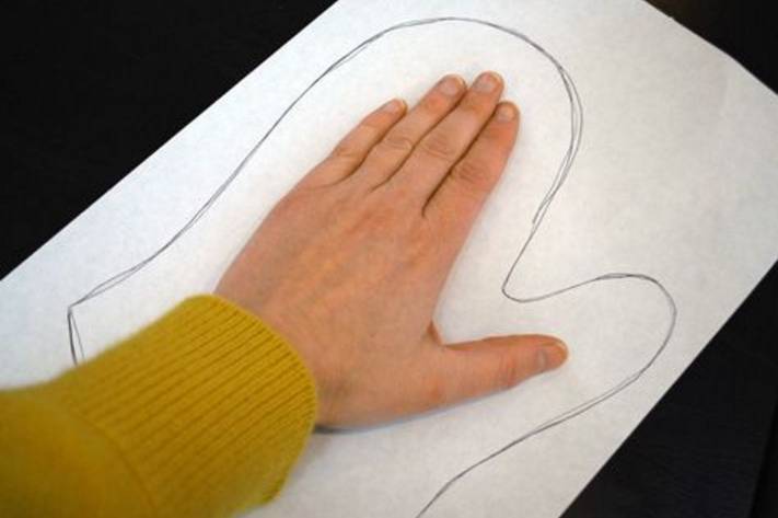 - Первое — выкройка. Сделать ее очень просто. Для этого достаточно приложить ладонь к обычному листку А4, сложить руку как будто вы собираетесь надеть варежку и обвести ее силуэт, отступая от него минимум на 2,5-4 сантиметра.