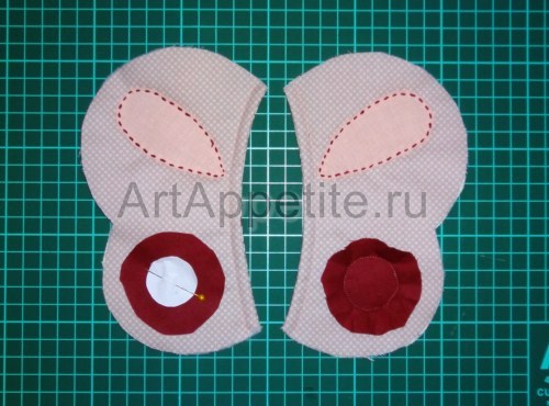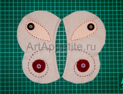 Для аппликации на крыльях вырезаем деталь в виде капли с припусками 5 мм. Пришиваем её ручным швом. Для второго украшения выкраиваем круглую заготовку с помощью шаблона. Её диаметр должен быть в два раз больше, чем диаметр украшения в готовом виде. Размещаем заготовку и шаблон на крылышке, пристрачиваем по окружности.