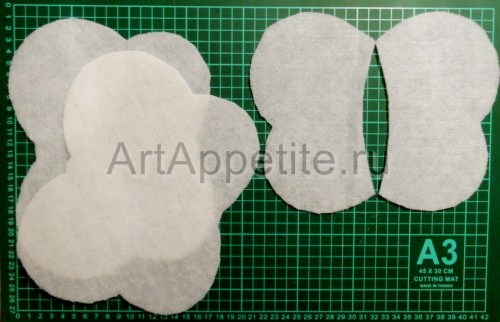 Из синтепона вырезаем 2 большие и 2 маленькие детали. Припуски по 5 мм предусматриваем на внутренней стороне крыльев.