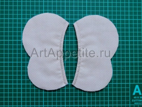 Укрепляем наружную деталь крыльев синтепоном. Сложив заготовки для крыльев лицевыми сторонами внутрь, стачиваем их по внутреннему краю. По припускам делаем надсечки, выворачиваем крылышки. Отстрачиваем по краю на расстоянии 3-5 мм от сгиба.