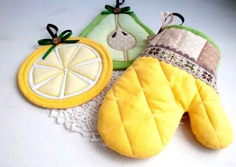 Если вы выбрали узорчатую ткань, украшать прихватки необязательно. Но если у вас появилось желание немного разнообразить их внешний вид, можете воспользоваться лентами, рюшами, кружевными вставками, тканевыми аппликациями и нитями для вышивки.