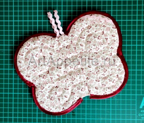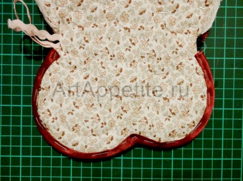 Поскольку из-за рисунка на ткани декоративные швы практически не видны, то они для наглядности показаны на фото ниже, на изделии из другой ткани. Если вы сошьёте слои изделия по своему рисунку прострочки, отступив от схемы, то это вполне допустимо. Главное для прихватки, чтобы рисунок был симметричным.