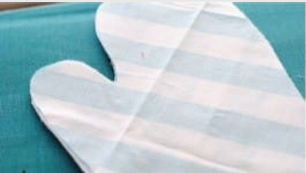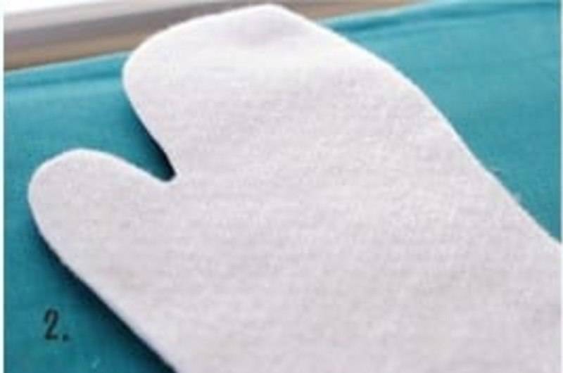 - Далее следует обработка наполнения варежки. Выбрав для него плотную несинтетическую ткань, вырежьте из нее два лоскута по уже намеченному лекалу.