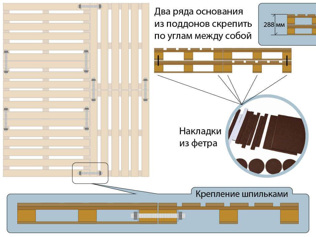 Поскольку основание состоит из нескольких поддонов, на каждый поддон рекомендуется 4 ножки. Это предотвратит чрезмерную нагрузку на крепеж, которым паллеты будут соединяться друг с другом.