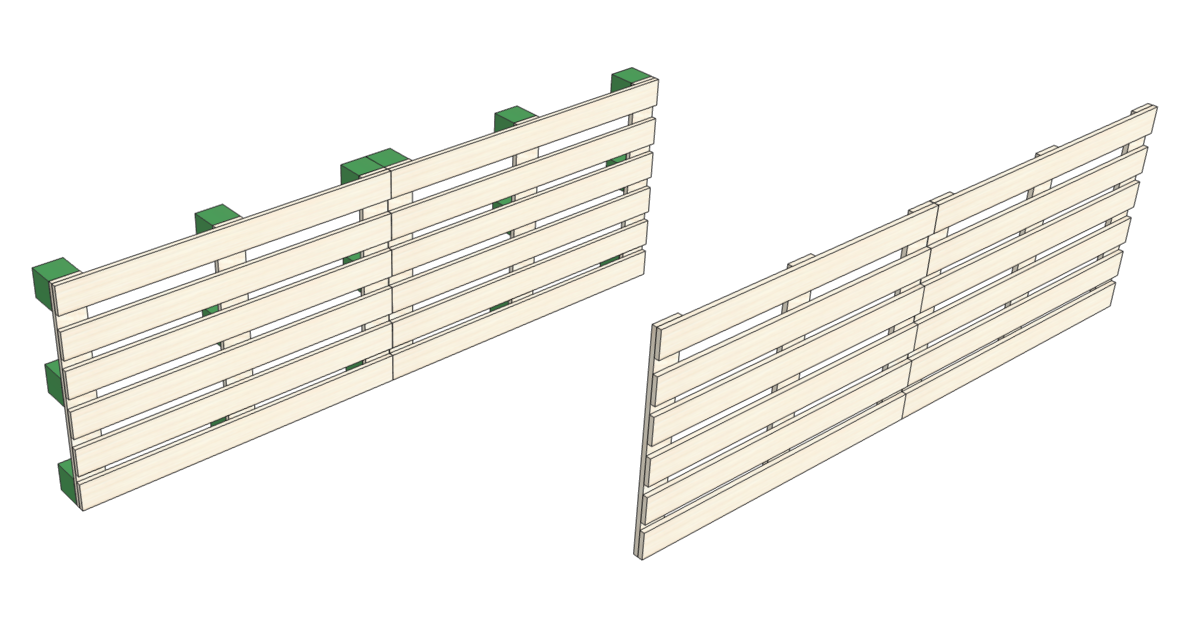 После сушки разобранные поддоны собираются с помощью саморезов. Далее, в зависимости от конструкции кровати, приступают к их комбинированию и стыковке.