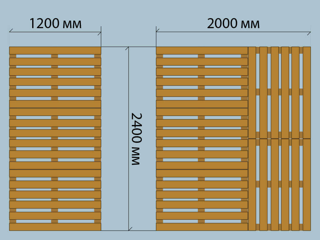 Готовые короба для грузоперевозок стандартных размеров – 120х80 см, то есть для односпальной кровати или ложа для ребенка понадобится 2 поддона.