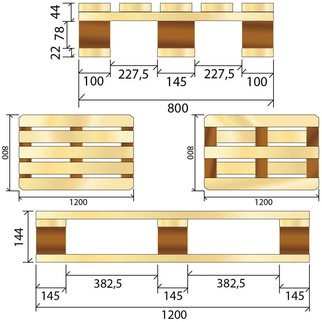 Размеры стандартного европоддона 800 х 1200 мм, высота 144 мм, вес 20-24 кг. Максимальная нагрузка, которую он может выдержать, составляет более 1,5 тонны.