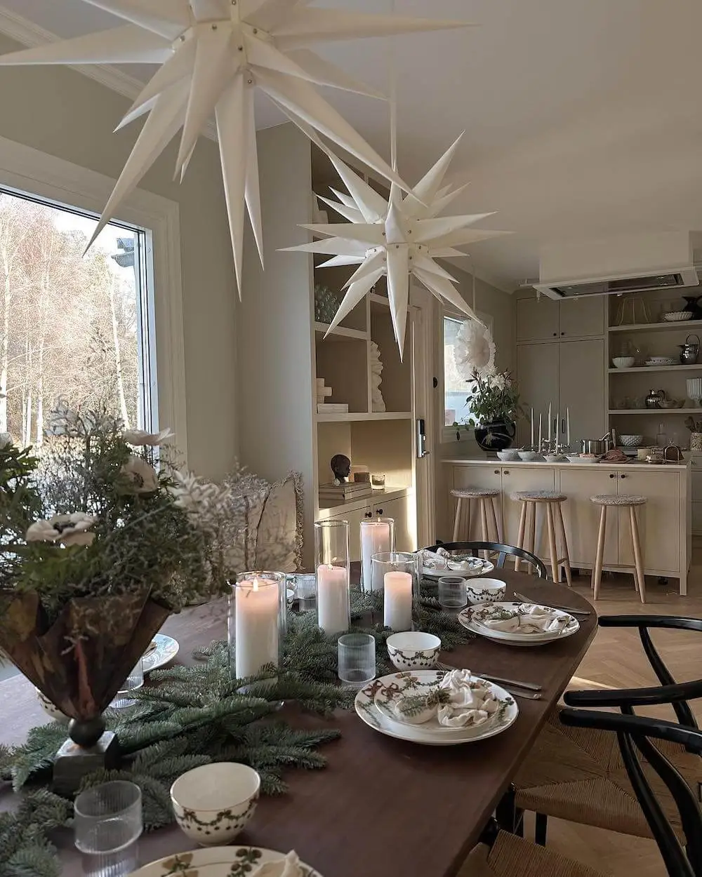 Для скандинавского стиля характерны светлые оттенки и эко детали. В качестве скатерти можно выбрать льняную или хлопковую ткань, а под тарелки подложить джутовые салфетки натуральных оттенков.