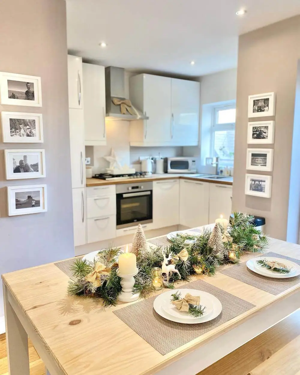 Разбавить декор можно минималистичными подсвечниками и небольшими вазочками с хвойными веточками. Допустимо добавить салфетки с растительным орнаментом.