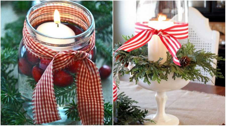 В вазу можно поставить хвойные ветки или сухоцветы, эвкалипт. Свечи можно разместить в простых прозрачных или белых подсвечниках.