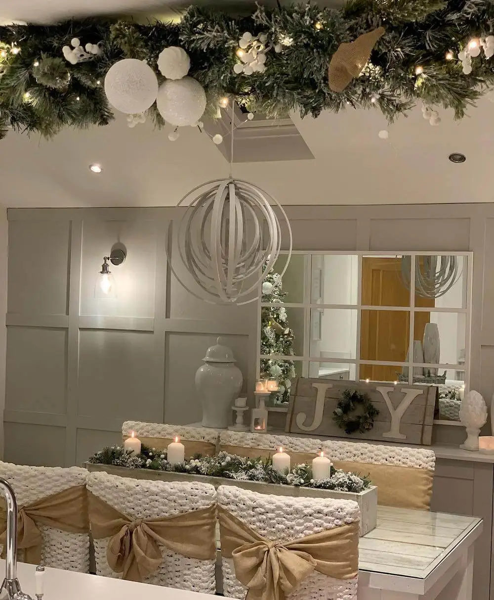 Если стол слишком маленький и на него нельзя поставить много украшений, обратите внимание на небольшие детали. Например, можно украсить спинки стульев в стиле черного кролика или подвесить новогодние элементы на нитки над столом