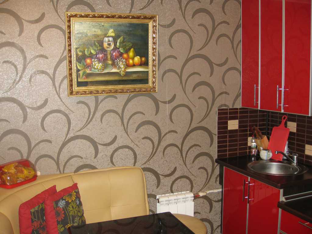 Нередко применяют обои. Выбирают полотна с рисунками, рельефными фактурами, также красиво смотрится имитация натуральных материалов: дерева, камня, кожи. На некоторых фото дизайна кухонь 6 квадратных метров можно встретить отделку обоями двумя цветов. Противоположная стена от дверей оформляется более светлым тоном, что визуально несколько увеличивает пространство.