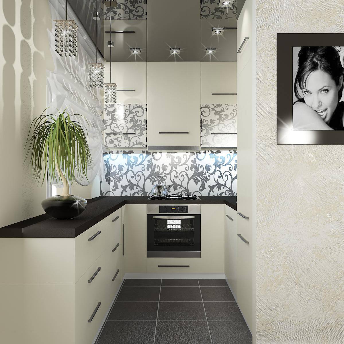 На маленькой площади важна любая деталь. Так, на фото дизайна кухни 6 кв м в малогабаритной брежневке ясно видны невысокие потолки. Самым оптимальным вариантом отделки считается побелка таких поверхностей. Выигрышно смотрятся натяжные потолки с глянцевой текстурой, имеющей зеркальный эффект.