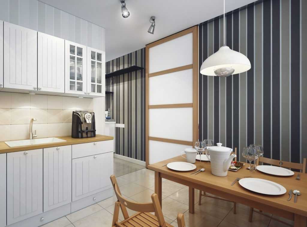 Если помимо маленькой площади кухня имеет недостаток в виде непропорциональной формы, например низкие потолки, длинная форма прямоугольника, такие изъяны разрешит рисунок стен. Кухне с низкими потолками подойдут светлые обои с рисунком в полоску по вертикали, визуально это вытянет комнату. Длинное помещение внешне сократит рисунок на стенах в виде полосок по горизонтали.