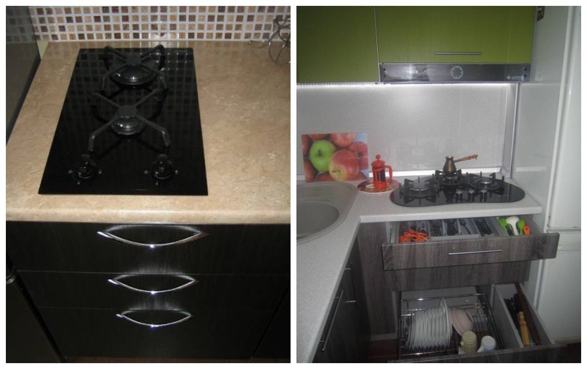 Для маленьких кухонь разумней не покупать готовые гарнитуры, а заказывать изготовление по индивидуальным замерам. И если с длиной и высотой все понятно, то можно предусмотреть и другие возможности в кухонной мебели.