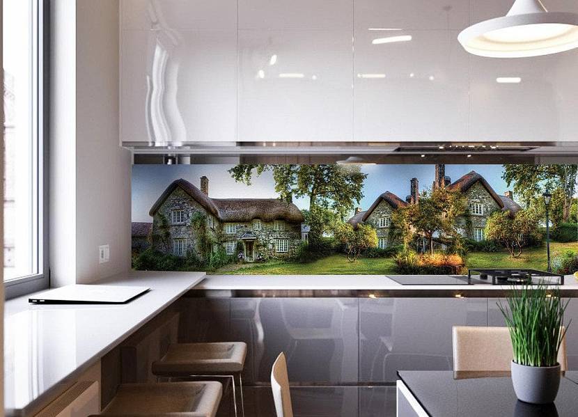 Скинали с фотопечатью на кухонном фартуке отображают милую деревеньку Источник door39.ru