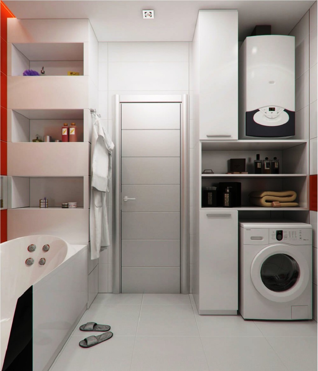 Как вариант, можно рассмотреть идею встроенного шкафа, где нижняя часть отведена под домашнюю прачку, а в верхней установлен бойлер. Шкаф обеспечивают дополнительными функциями, встраивая несколько рядов полок, на которых удобно хранить моющие средства, туалетную бумагу, полотенца.