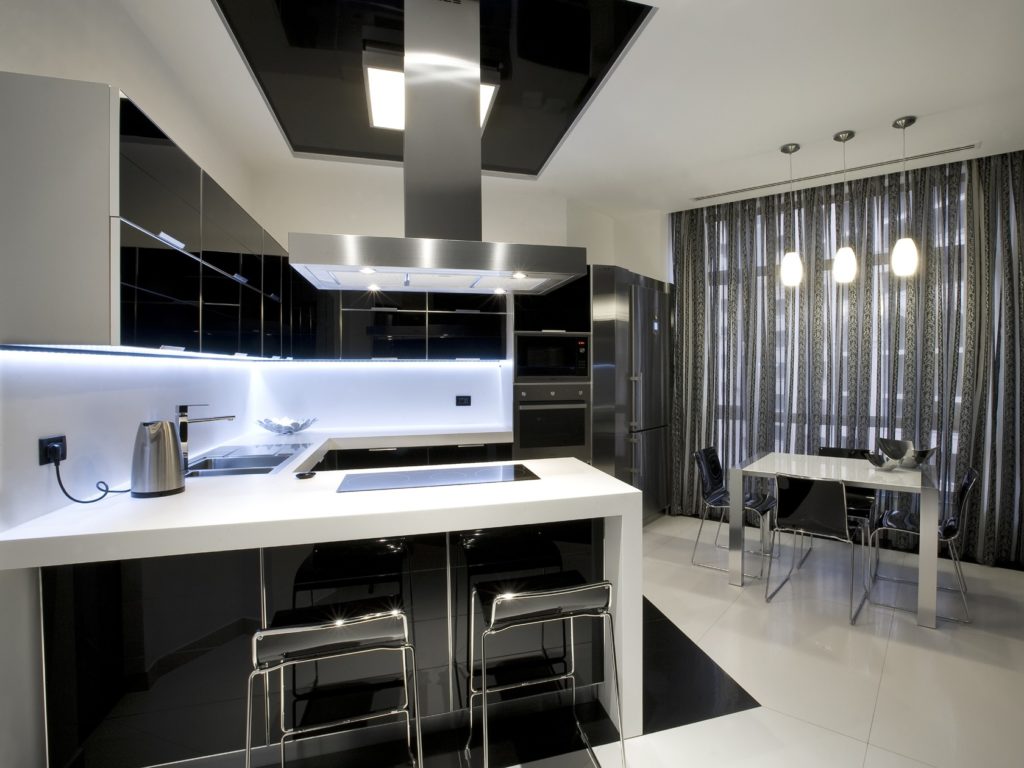 При выборе этого стиля для отделки кухни нужно ориентироваться на обилие белого, черного, графита и серебристого цвета. В гарнитуре и бытовой техники обязательно наличие на фасаде металлических блестящих элементов.