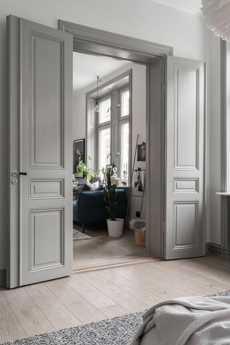 Скандинавский стиль, лофт, минимализм – во всех этих стилях серые двери используются чаще всего. Обычно они просто служат фоном и не привлекают к себе лишнего внимания. Если вы используете активный декор, например, объемное панно на стене, крупные люстры, большое количество зеркал, необычные предметы мебели, двери вовсе не обязаны становится еще одним акцентом. В этом случае, чем проще их дизайн, тем лучше.