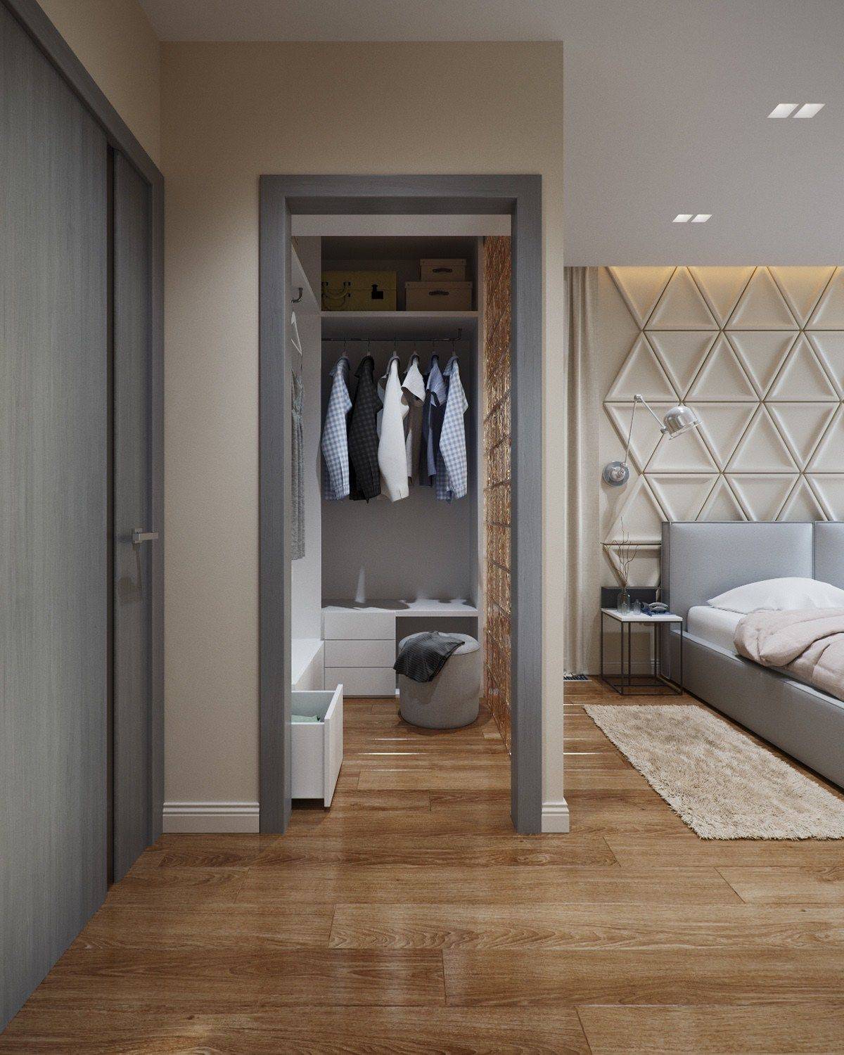 На фото монохромное сочетание пола с дверной конструкцией в интерьере современной спальни.