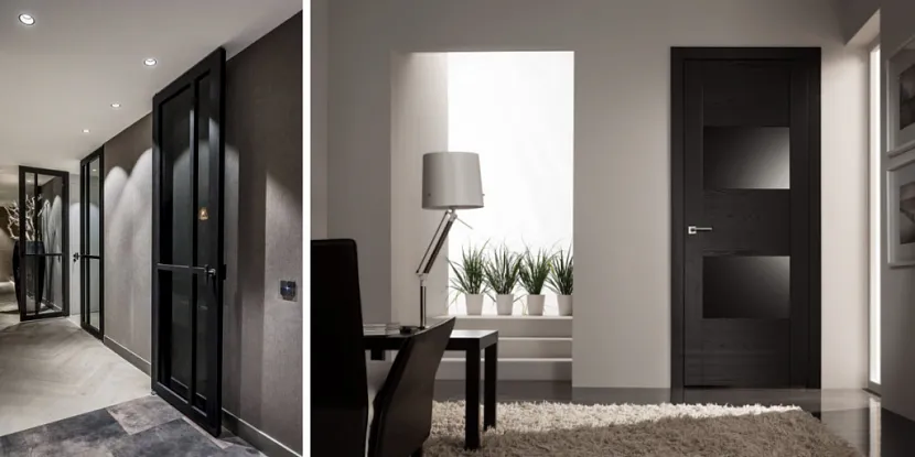 - Если вы желаете идти в ногу со временем, учитывайте, что современные решения характеризуются межкомнатными дверями тёмных оттенков, выполненных из ясеня, ореха, венге, экзотического дуба или тика.