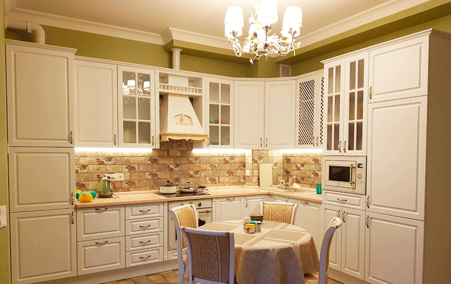Классические угловые кухни подходят для просторных помещений, так как резные фасады и обилие декора «съедают» пространство.