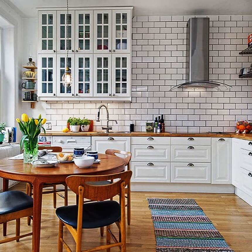 Не теряет популярности скандинавский стиль. Его основные характеристики: простота, практичность, строгость линий, сдержанная элегантность. Основа интерьера — светлые оттенки, которые сочетают с другими (в том числе с яркими акцентами). На кухонном пространстве должно быть минимум мебели (она функциональная), техника встроенная, декор отсутствует или его мало. Большие окна, прикрывают рулонными шторами или жалюзи. Осветительные приборы встроены в потолок или выступают как акцента.