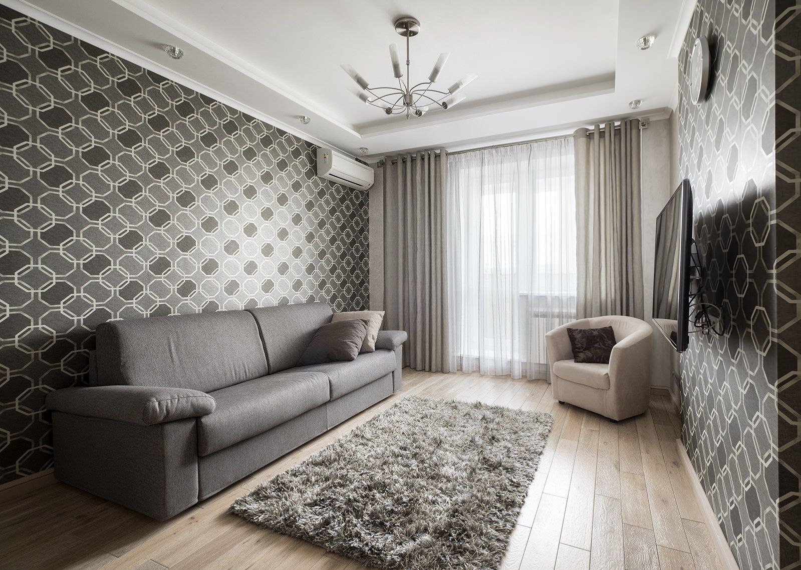 Для зала важно подобрать нужный тон серых обоев – не используй насыщенные графитовые краски в маленькой гостиной, чтобы визуально не сжать пространство