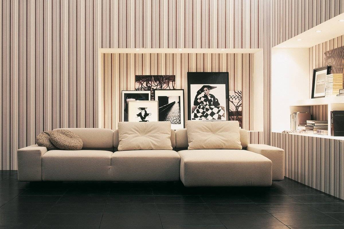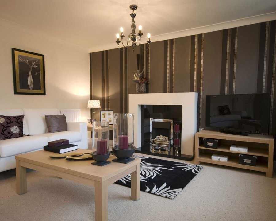 В гостиной с низкими потолками стоит поклеить обои с вертикальными полосками, они визуально добавят высоты стенкам.
