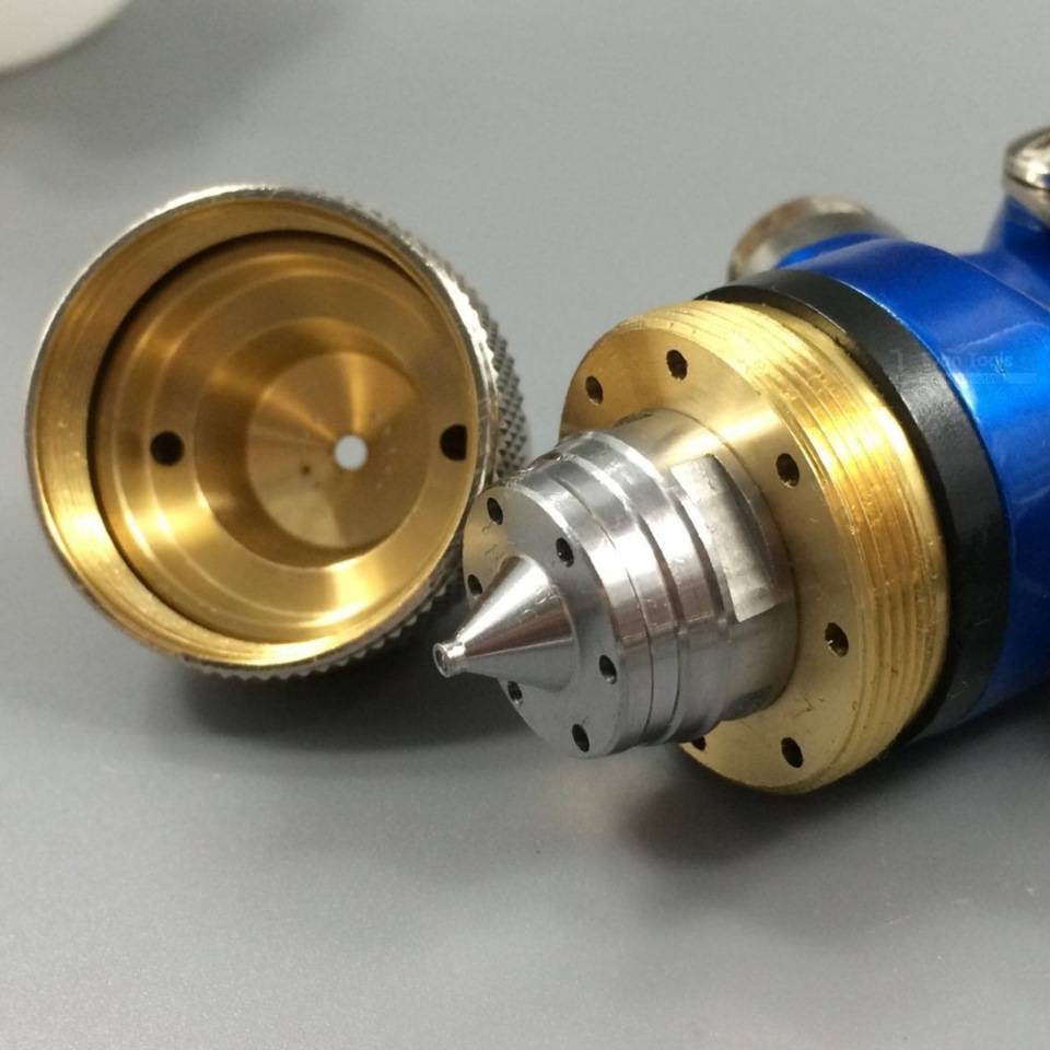 Через сопло распыляется краска. А если в него вставить иглу, то можно отрегулировать поток жидкой смеси. Диаметр сопло следует выбирать под вязкость краски. Чем гуще консистенция, тем дюза должна быть шире. Тогда раствор не застрянет. А для жидкой смеси наоборот — требуется узкий диаметр. Иначе краска будет вылетать крупными каплями, создавая кляксы.