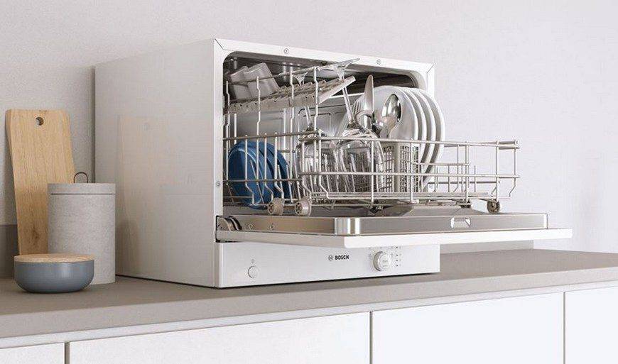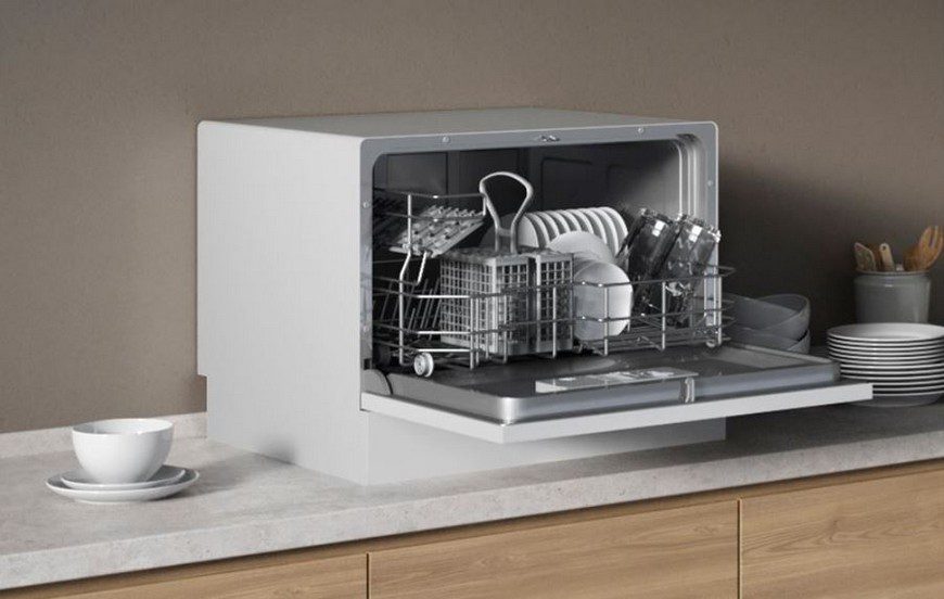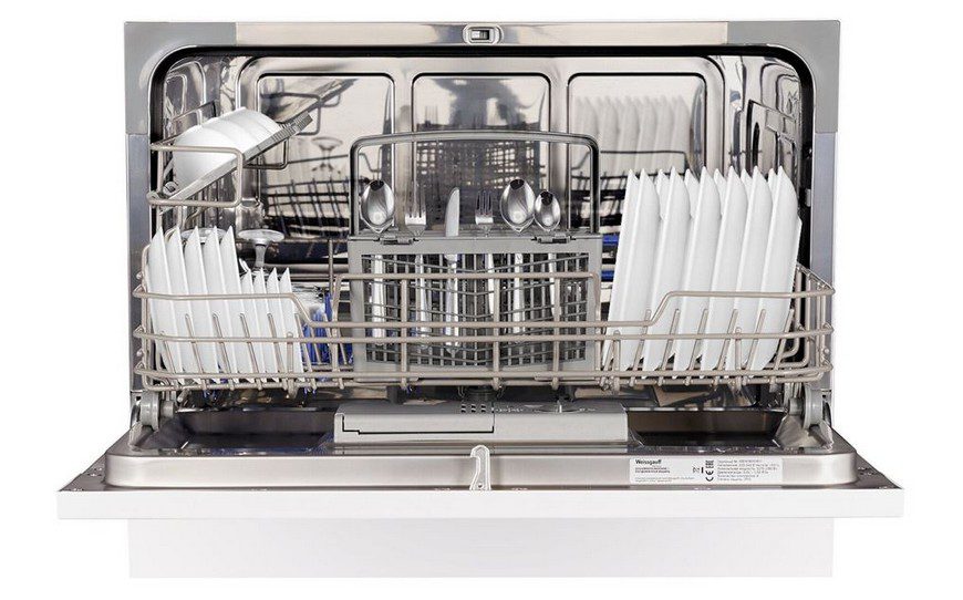 Если речь идет о машине с загрузкой за один цикл до шести полных комплектов посуды, то ее размеры составляют 55x45x55 см. Может поместиться в кухонный шкаф и не займет много места на столешнице.