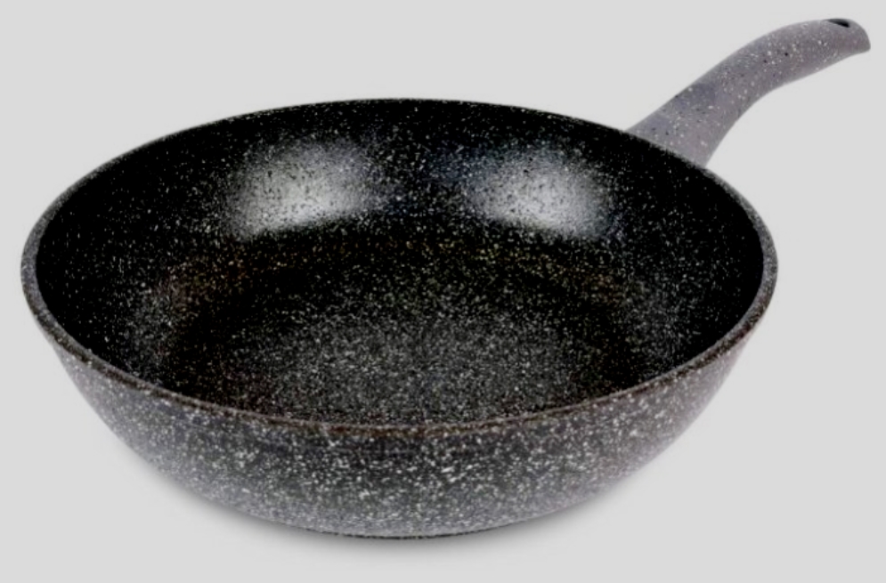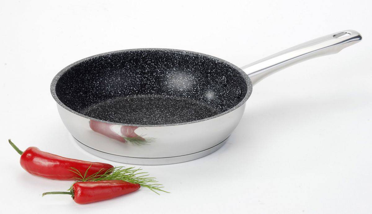 Эта многослойная конструкция характеризуется классической формой исполнения. Сковорода выглядит стильно. В качестве антипригарного напыления производителем используется состав на основе частичек гранита. Прочные минеральные кристаллики мрамора благоприятно сказываются на удобстве использования изделия и его эксплуатационном сроке. За повышенную прочность и практичность отвечают армирующие звенья. Несмотря на диаметр в 240 мм, конструкция достаточно вместительная. Толщина стенок – 0,6 см. В процессе существенного нагрева риск деформации исключается.
