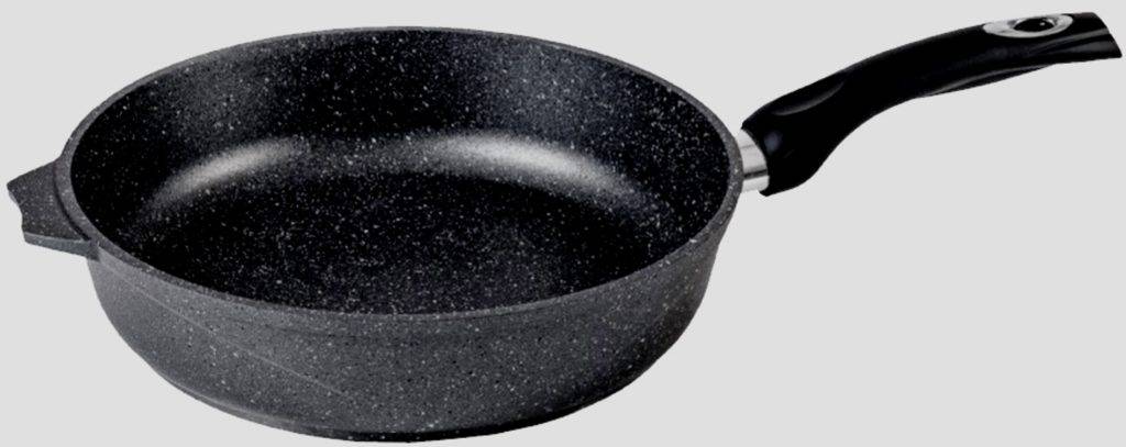 Отличная сковорода от отечественного производителя Нева. Именно такую конструкцию лучше купить тем хозяйкам, которые привыкли готовить часто и помногу. Толщина дна – 0,6 см. Вес – 1,3 кг. Продукт от именитого питерского производителя характеризуется высоким показателем износостойкости и прочности. Изделие оснащено высокими бортиками и достаточно толстыми стенками. В качестве антипригарного напыления выступает состав на основе мраморной крошки. Это позволит готовить без масла. Рекомендуется купить сковороду через фирменный интернет магазин. В противном случае наценка составит свыше 500 рублей.
