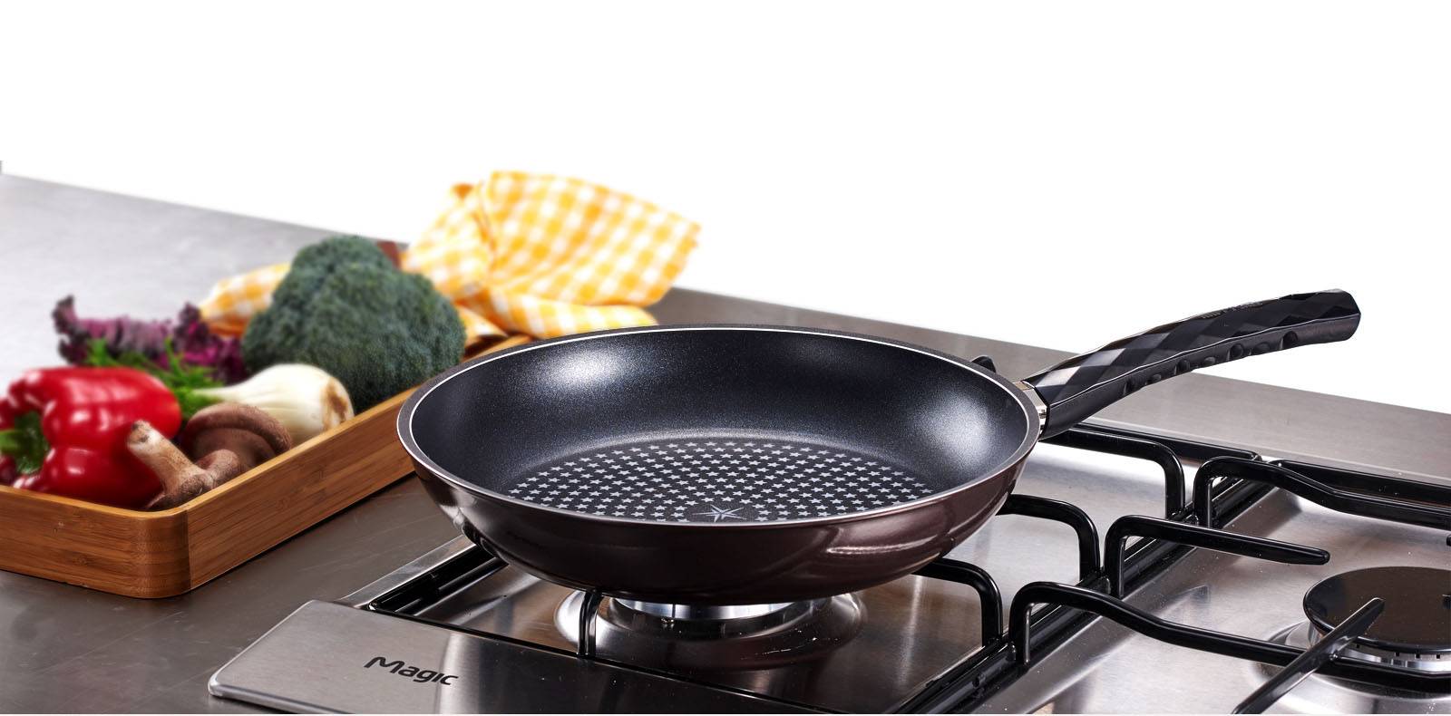 Сковорода PF2422C выполнена из литого алюминия и покрыта термостойким антипригарным слоем как внутри, так и снаружи. В составе покрытия присутствуют анионы, которые сокращают время приготовления блюда. Посуда совмещается со всеми типами плит, в т.ч. с индукционными.