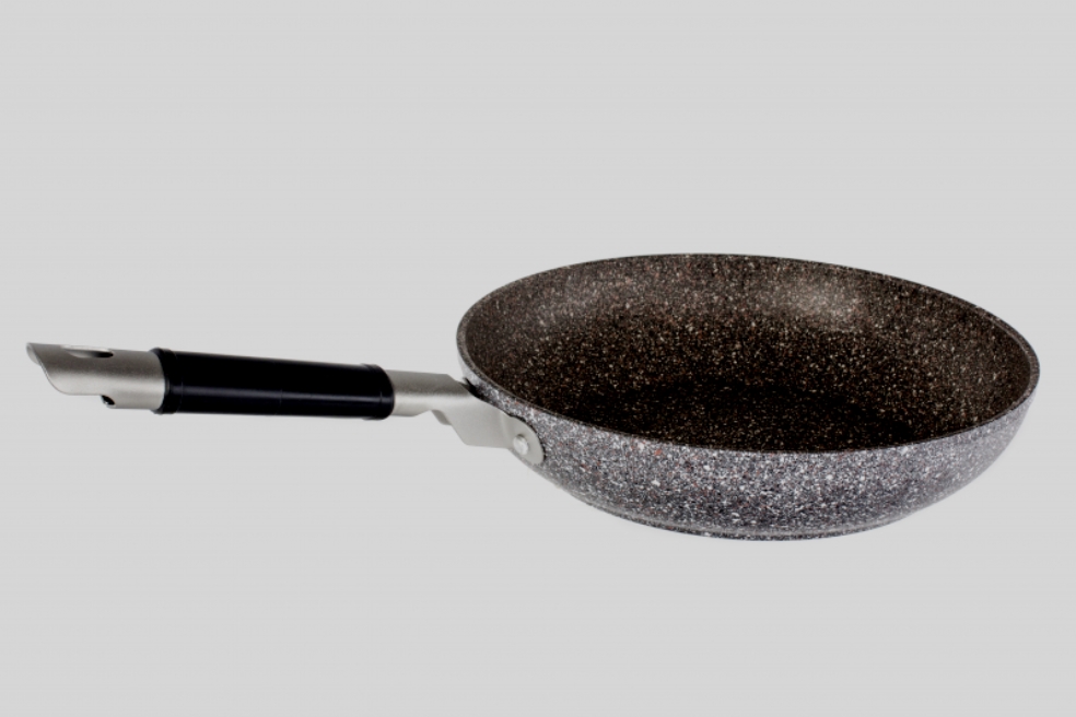 Перед тем, как выбрать эту модель, следует отметить, что для ее изготовления используется литой материал. К тому же производитель позаботился о нанесении качественного антипригарного напыления. В качестве усилителя применяется армированные минеральные частицы (мраморные). Для переворачивания продуктов не рекомендуется использовать металлические изделия, в то время как внешнее покрытие подобной утвари их не боится. Характеризуется стойкостью к существенному нагреву, поэтому сковорода может использовать в комплексе с любыми плитами. Эксплуатационный срок продукта от именитого итальянского бренда – 10 лет при условии регулярного пользования.