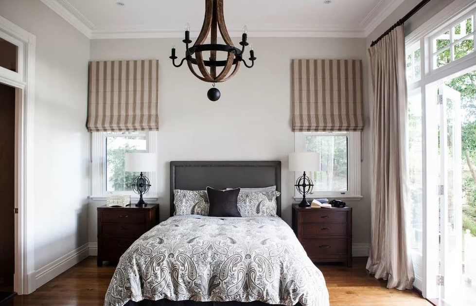 Римские шторы – популярный вариант для небольших спален, оформленных в современном или этническом стиле. Они не занимают много места, быстро трансформируются, стильно выглядят, а для их пошива не требуется много ткани. Вариантов расцветок – масса, есть возможность использования для оконных проемов любой формы и размеров. Специалисты советуют выбирать римские шторы либо с интересным орнаментом, либо насыщенных цветов.