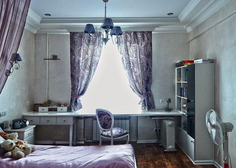 Например, если обои светло-серые, а обивка или накидка мягкой мебели фиолетовая, то шторы могут быть не однотонными – с серым и фиолетовыми рисунками на белом или бежевом фоне. Стоит положить на диван декоративные подушки, часть их – из той же ткани, что и шторы, а вторая часть – из серого материала, который по цвету будет гармоничен с обоями. Ковер (если он необходим) должен быть серым, но на несколько тонов темнее, чем стены.