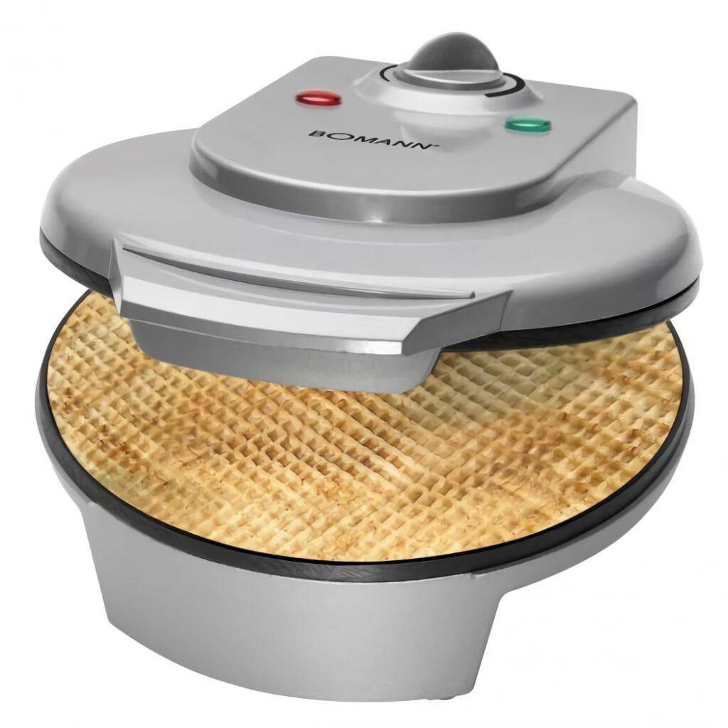 Округлая вафельница для приготовления одной тонкой вафли. Модель комплектуется специальным конусом для закручивания из нее рожка. Производитель – немецкий бренд «Bomann».