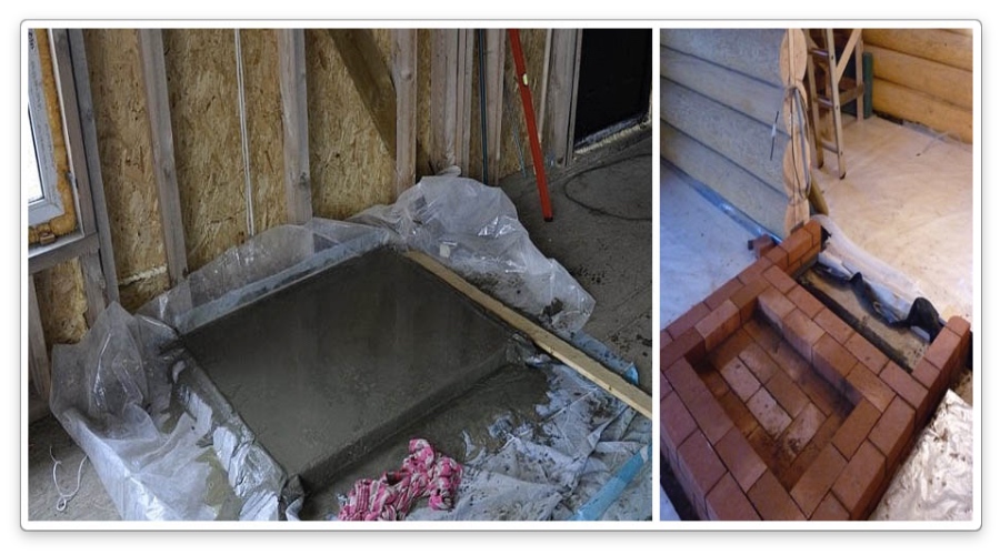 После заливки фундамента следует выдержать бетон до набора критической прочности примерно 5-7 суток, после этого можно приступать к разметке и кладке камина, предварительно уложив двойной слой дополнительной гидроизоляции – рубероида.