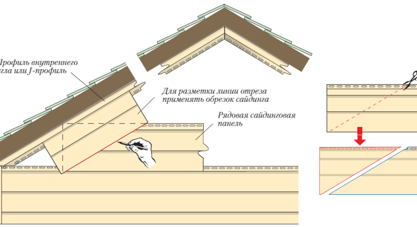 Чтобы обшить фронтон, используют профили для внутренних углов или стартовые. Технология монтажа похожа на облицовку основной части стены. Точно также нужно подрезать панели и помнить о зазорах в 6 и 9 мм. Последний самый верхний участок фронтона можно закрепить саморезом прямо через материал панели. Так можно делать только здесь, в остальных случаях сверление отверстий не допускается.