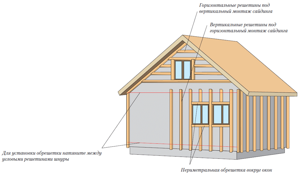 Отделка деревянного дома начинается с монтажа направляющих. Для подавляющего большинства сайдинга обрешетку требуется крепить вертикально. Ее шаг подбирается в зависимости от утеплителя. Расстояние в чистоте между направляющими должно быть на пару сантиметров меньше ширины минеральной ваты. Для полистирола расстояние подбирается точно под ширину.